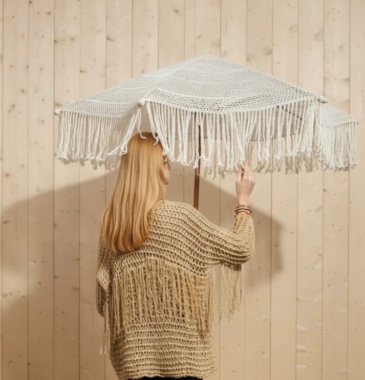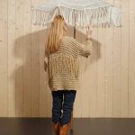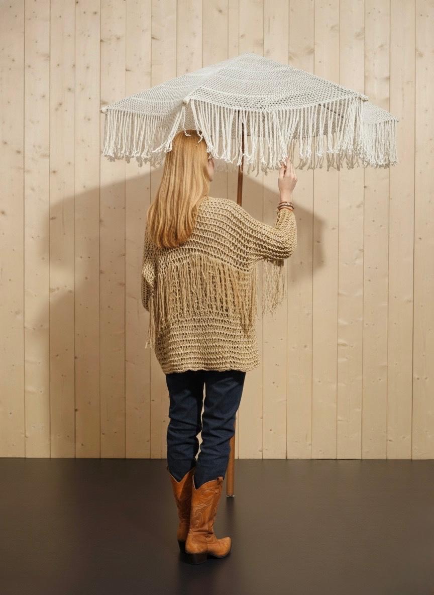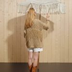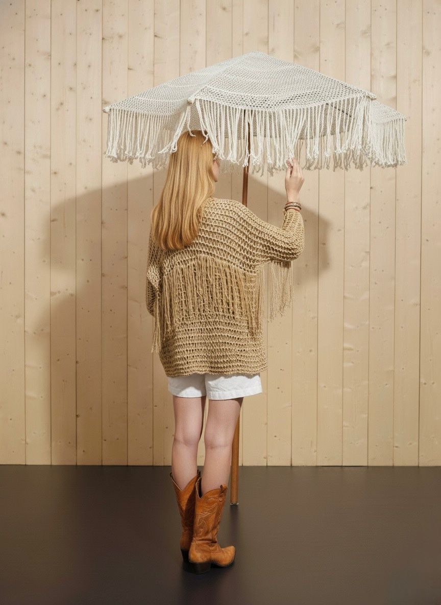 Cardigan mini confeccionado à mão em fitas e fios de seda dourado, ocre e bronze, modelagem solta, manga longa,  franjado nas costas e mangas.